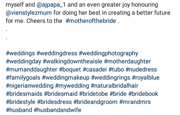 ‘Oh! the grieve I got because I asked my mother who had me at the age of 15, to walk me down the aisle. I appreciate the idea of having a great dad walk the child down, but when my own father refuses to be present in my life should I killl myself . I found great joy in having a female marry myself and an even greater joy honouring at vienstylezmum for doing her best in creating a better future for me. Cheers to the #motherofthebride.”