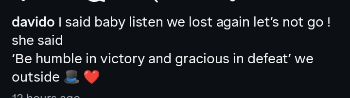 ”I said baby listen we lost again. let’s not go. She said be humble in victory and gracious in defeat we outside“,The post reads.