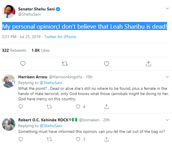 Shehu Sani in reaction to claim of Leah Sharibu being killed by Boko Haram insurgents, made known his doubt.
