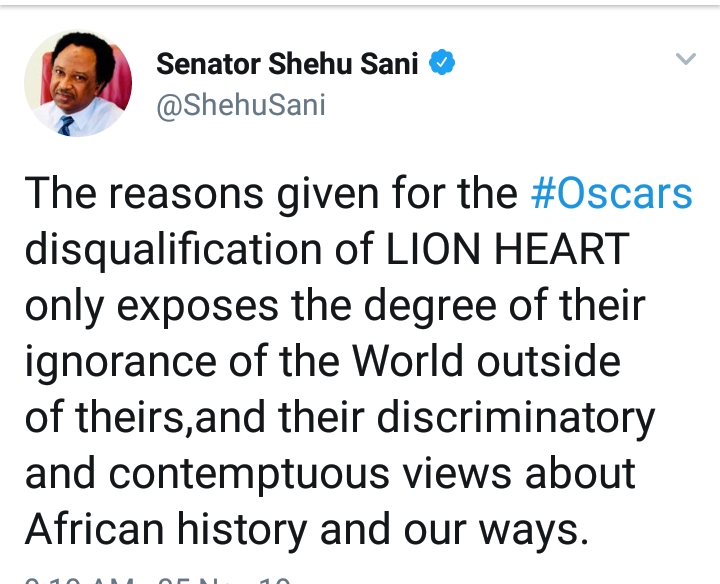 Former Senator representing Kaduna, Shehu Sani took to his twitter account to react to the trending news of Genevieve Nnaji movie Lionheart ‘s been disqualified from Twitter.