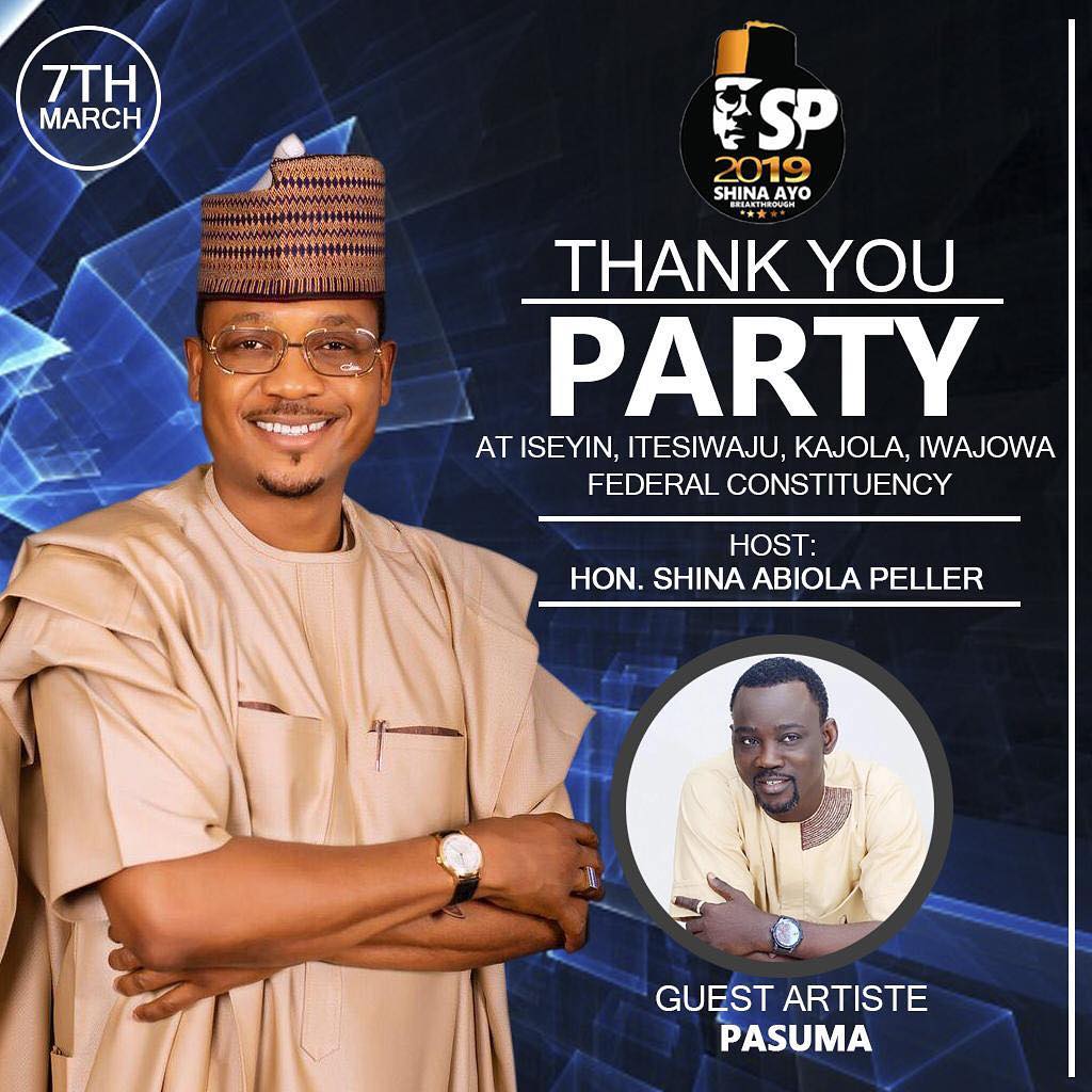 Hon. Shina Abiola Peller the newly elected Rep in Ibadan is set to hold a thank you party today.