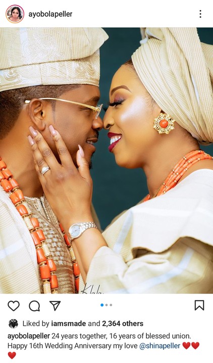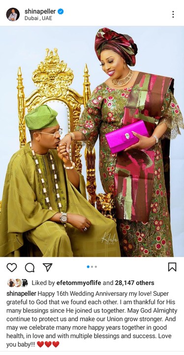 Popular Quilox Club owner and Politician, Shina Peller has shared photos on his Instagram page celebrating his wife, Ayobola Peller, on their 16th wedding anniversary. He wrote: