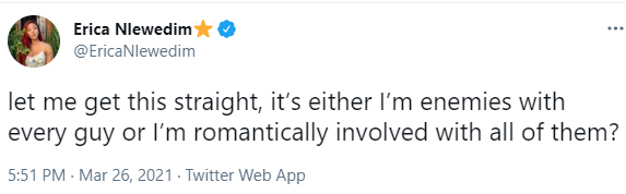 Erica whose relationship with her fellow BBNaija star, Kiddwaya, has since packed up, said this on her Twitter on Friday today March 26.