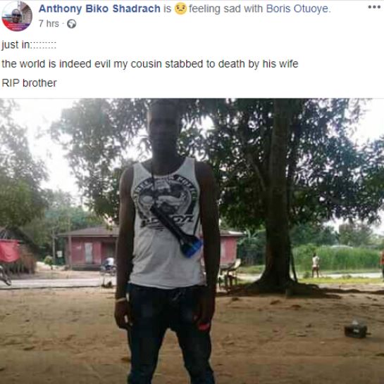 Facebook user, Anthony Biko Shadrach insinuated that his cousin was stabbed to death by his wife because he was seeing other women.