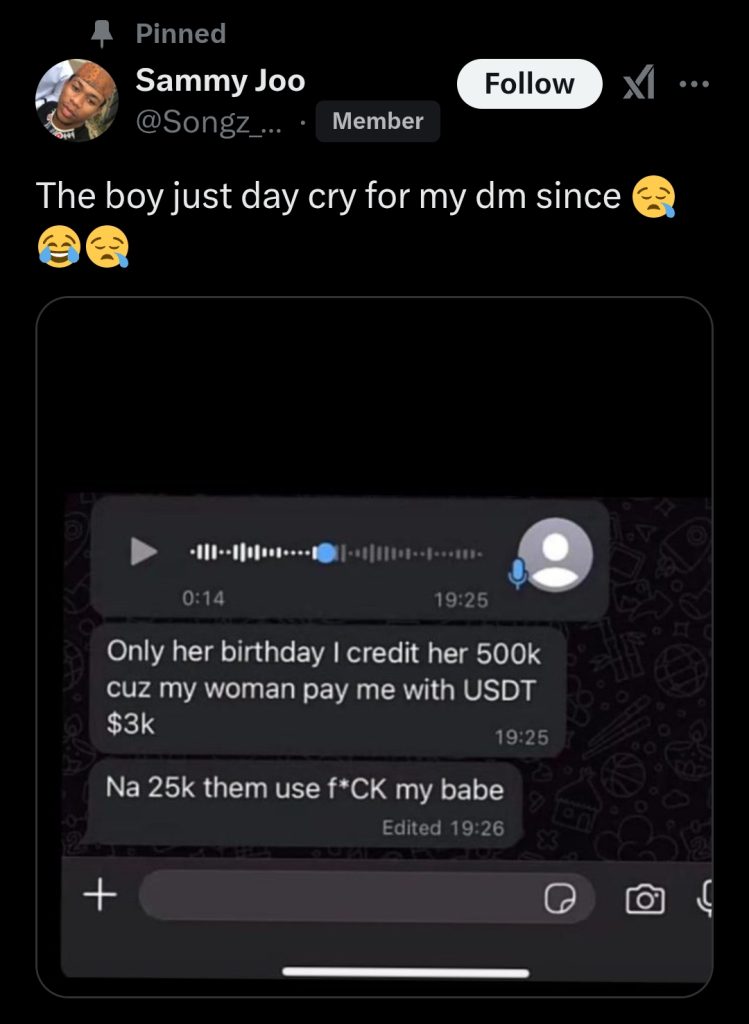 A Yahoo boy laments after sending his girlfriend ₦500k for her birthday, only to discover someone else got intimate with her for ₦25k.