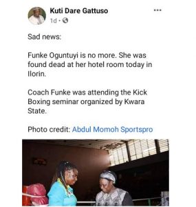The deseased was participating in the Kwara Zonal and Invitational Kickboxing Championship organised by the State Government. She officiated in the competition and also fielded two athletes.