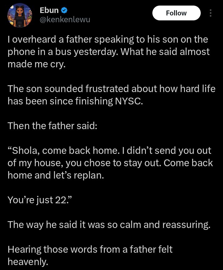 According to the witness, the incident happened while commuting on public transport when a man sitting nearby received a call from his son who sounded deeply frustrated about life after completing the National Youth Service Corps (NYSC).