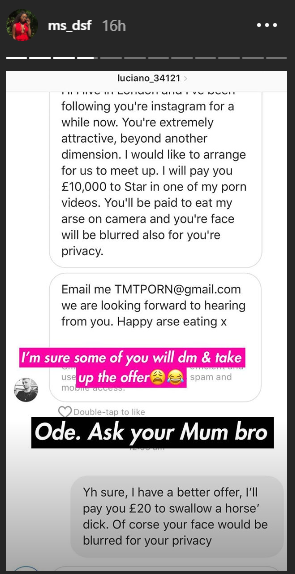 The man promised that her face will be blurred in the video and all she has to do is eat his butt. He signed the proposition off with “happy arse eating”.