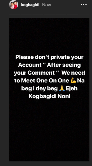“Don’t private your account after seeing your comment. We need to meet one on one, na beg I dey beg