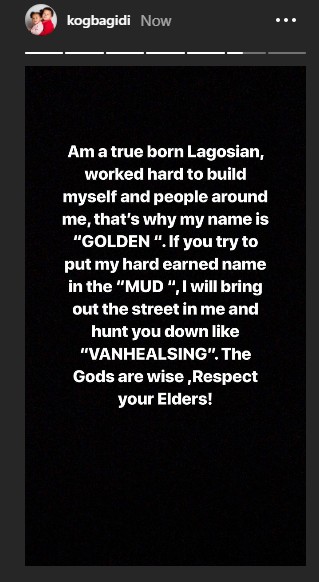 “Am a true born Lagosian, worked hard to build myself and people around me, that’s why my name is “GOLDEN “. If you try to put my hard earned name in the “MUD “, I will bring out the street in me and hunt you down like “VANHEALSING”. The Gods are wise ,Respect your Elders! ”