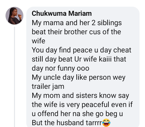 “My mama and her two siblings beat their brother because of the wife. You dey find peace, u dey cheat, still dey beat your wife. Kaii that day nor funny. My uncle dey like person wey trailer jam. My mom and her sisters know say the wife is very peaceful, even if you offend her na she go beg u. But the husband tarrr,” she wrote.
