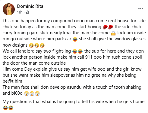 “This one happen for my compound oooo man come rent house for side chick so today as the man come they start boxing. The side chick carry turning garri stick nearly kpai the man she come lock am inside run go outside where him park car, she shall give the window glasses new designs,” she wrote.