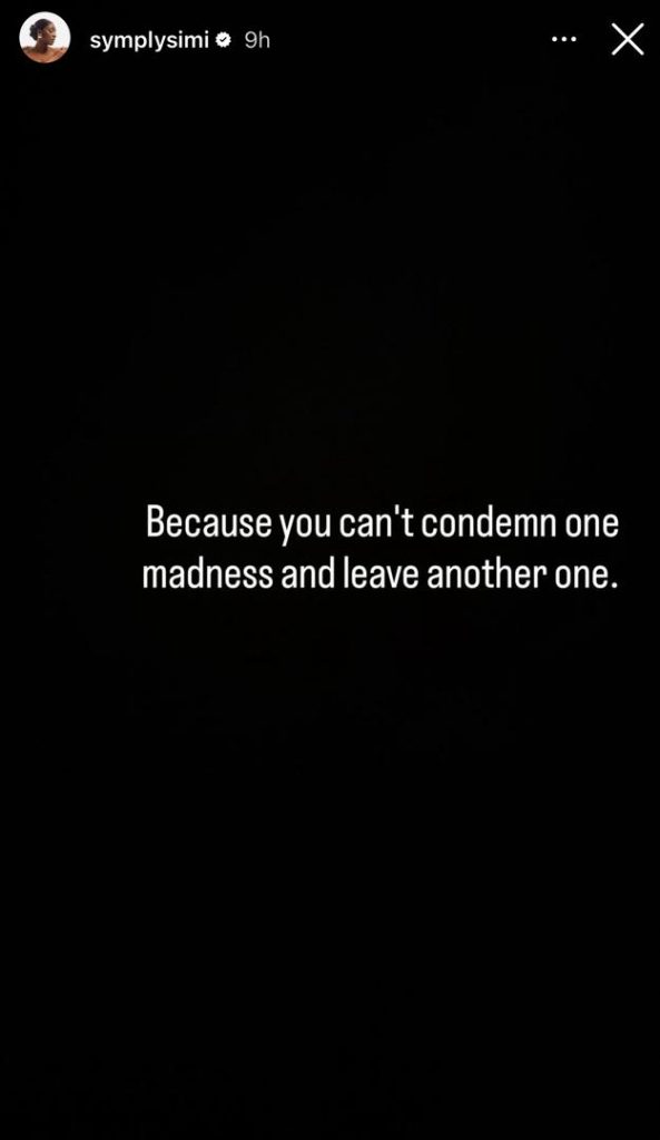 In a post shared on her Instastories, Simi argued that someone recorded Comfort being forcefully ejected form the aircraft, recorded her being indecently exposed and went on to release the video unedited online, The singer said if we are treating one “madness,” punishing Comfort, we must also not forget to sanction the indecent exposure of the officer as well.