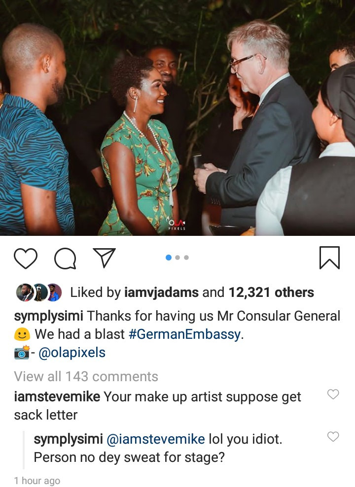 To which Simi replied good-naturedly: “lol you idiot. Person no dey sweat for stage again?”