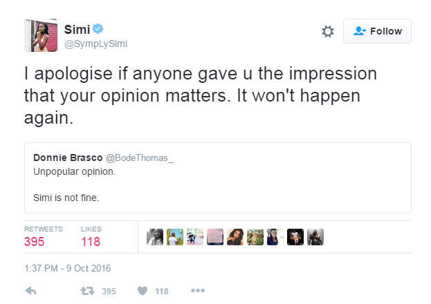 Simi slams Twitter user who said she is not fine