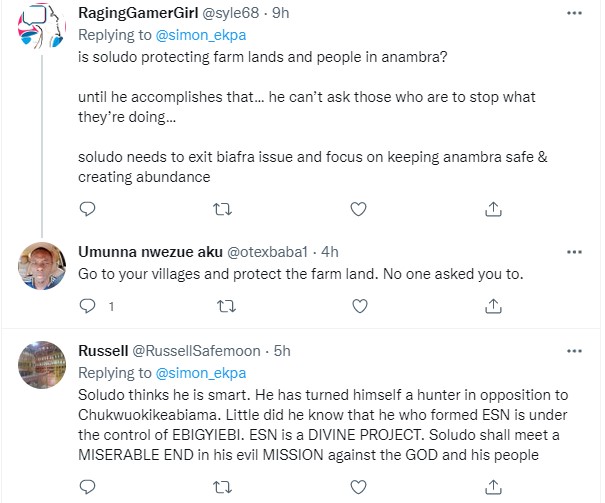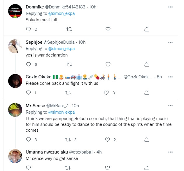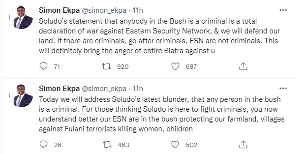 Soludo’s statement that anybody in the Bush is a criminal is a total declaration of war against Eastern Security Network, & we will defend our land. If there are criminals, go after criminals, ESN are not criminals. This will definitely bring the anger of entire Biafra against u.