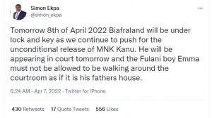 Tomorrow 8th of April 2022 Biafraland will be under lock and key as we continue to push for the unconditional release of MNK Kanu. He will be appearing in court tomorrow and the Fulani boy Emma must not be allowed to be walking around the courtroom as if it is his fathers house.