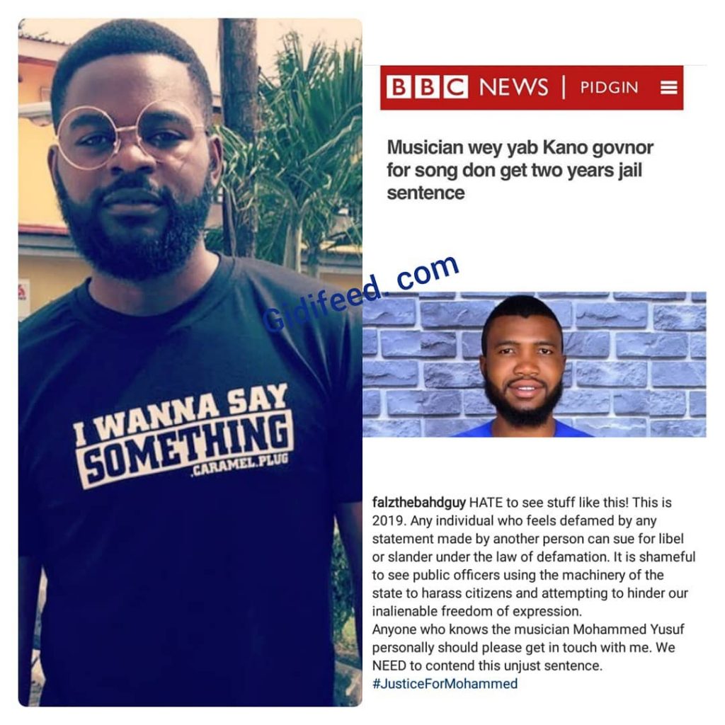 The singer took to his Insatgarm page to the news of musician Mohameed Yusuf been sentenced to two years in jail for defaming the character of Kano State Governor , Umar Ganduje.