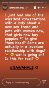 He wrote; “I just had one of the weirdest conversations with a lady about the new s3x trend and pets with women now, that girls now buy poppies to give them head? Some are actually in a love/s3x relationship with dogs? what is going on? Is this for real?”