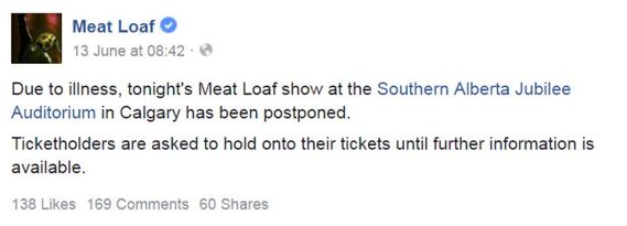 68 year old Rockstar, Meat Loaf was singing at the Jubilee Auditorium in Edmonton, Canadaon Thursdaynight, when he collapsed mid-way through his performance. He was rushed to hospital but his medical condition is still unknown at the moment.