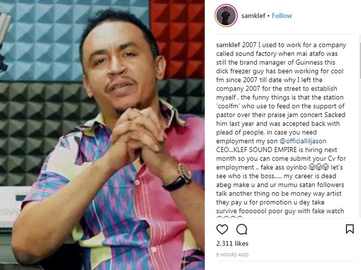 2007 I used to work for a company called sound factory when mai atafo was still the brand manager of Guinness this dick freezer guy has been working for cool fm since 2007 till date why I left the company 2007 for the street to establish myself , the funny things is that the station ‘coolfm’ who use to feed on the support of pastor over their praise jam concert Sacked him last year and was accepted back with plead of people, in case you need employment my son @officialliljason CEO…KLEF SOUND EMPIRE is hiring next month so you can come submit your Cv for employment .. fake ass oyinbo let’s see who is the boss….. my career is dead abeg make u and ur mumu satan followers talk another thing no be money way artist they pay u for promotion u dey take survive fooooool poor guy with fake watch