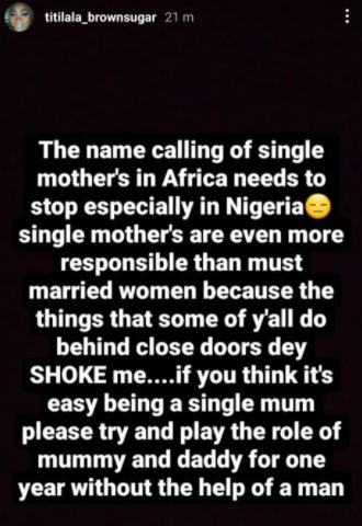 In a post shared on her Instastories, the reality TV star’s mum said the name-calling of single mums in Nigeria needs to stop.