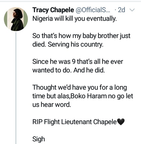 “Nigeria will kill you eventually. So that’s how my baby brother just died. Serving his country. Since he was 9 that’s all he ever wanted to do. And he did. Thought we’d have you for a long time but alas, Boko Haram no go let us hear word. RIP Flight Lieutenant Chapele” she wrote.