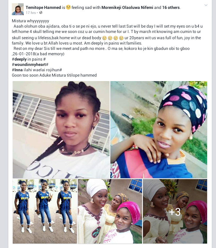 In a post shared on Facebook, mourning her sister and other girls, Temitope claimed that no blood was found on the scene because the girls were used for ritual by Yahoo boys.