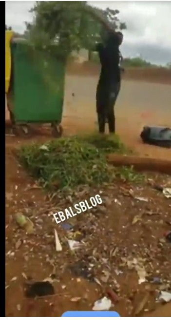 The beautiful lady throw the dirt on the ground instead of putting it inside the dust bin bucket that was provided on the road.