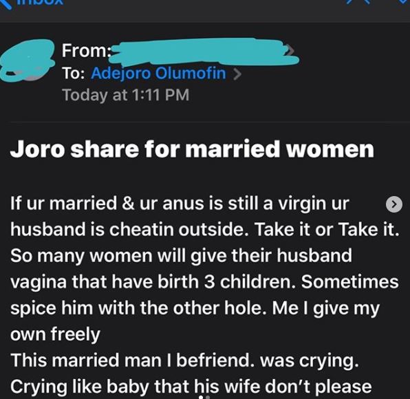 Relationship adviser and blogger, Joro Olumofin has shared a story of lady that has been enticing men with anal sex.