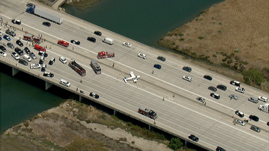 small single-engine airplane made an emergency landing on a California highway Tuesday, hitting several cars and lodging part of its wing into an SUV, according to local media reports. small aircraft took off from Montgomery-Gibbs Airport in San Diego before making the emergency landing.