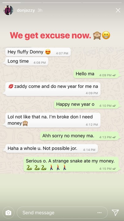 so as the ‘Snake Swallowing money’ trends in Nigeria Everyone is now using that as an Excuse, Here is a Convo between a Lady and Don Jazzy who begged him for small cash, but in reply he told her Snake ate his money.. lol.. no chill, funniest reply..