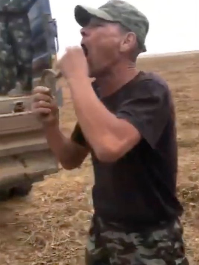Video footage shows the farm worker, 55, performing in front of his workmates in a watermelon field in Astrakhan, Russia, where he traps the dangerous reptile in his mouth.
