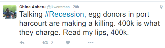 According to Portharcourt based journalist/sports anchor China Acheru, sperm donors are charging 150k, egg donors 400k in Port Harcourt. How tempting is this offer?