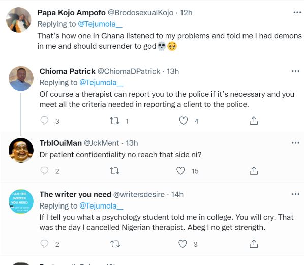 This came after a Twitter user stated that he won’t recommend therapy in Nigeria.