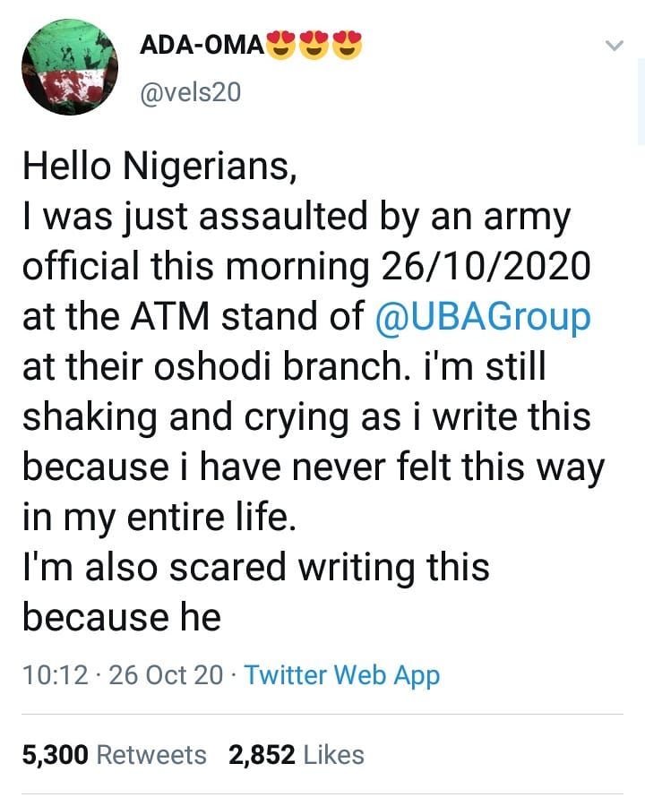 A lady by name Ada-Oma took to her Twitter page to share her bitter expernce with a nigeran soldier this morning.