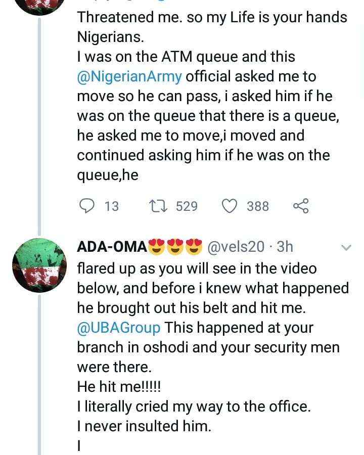 I’m also scared writing this because he Threatened me. so my Life is your hands Nigerians. I was on the ATM queue and this @NigerianArmy official asked me to move so he can pass, i asked him if he was on the queue that there is a queue, he asked me to move,i moved and continued asking him if he was on the queue, he flared up as you will see in the video below, and before i knew what happened he brought out his belt and hit me.
