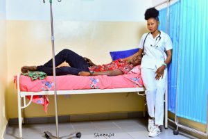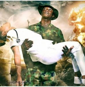 Nigerian military man carries his fiancée who is a nurse after rescuing her alive in war front in inspired pre-wedding photoshoot. The second picture where the military man lies on top of sick bed as his wife-to-be who is a nurse poses by him. Maybe the man needs treatment after the war! Lol