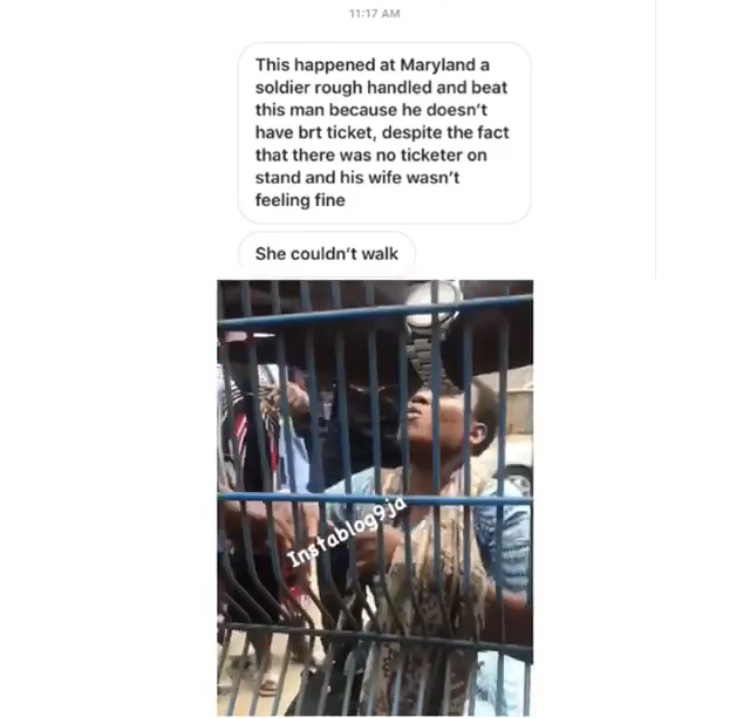 Soldier seen manhandling a man, yesterday, in Lagos, despite pleas from his sick wife…