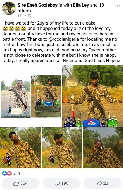 I have waited for 26yrs of my life to cut a cake and it happened today cuz of the love my dearest country have for me and my colleagues here in battle front. “Thanks to @rccolanigeria for locating me no matter how far it was just to celebrate me. In as much as am happy right now, am a bit sad bcuz my Queenmother is not close to celebrate with me but I know she is happy today. I really appreciate u all Nigerians God bless Nigeria..