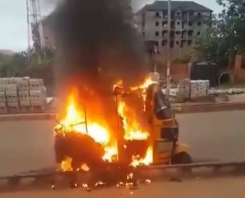 A tricycle was on Monday morning burnt by unknown gunmen who were allegedly enforcing the sit-at-home order of the Indigenous People of Biafra (IPOB) in Enugu State.