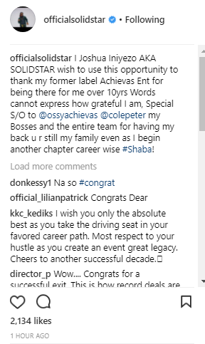 Nigerian Music Star Solid Star is starting the New Year Afresh, The Father of One just dumped his Record Label Achievas Entertainment after 10years since he was signed in, He shared a happy photo on his Instagram and announced that his beginning another chapter of his Life entirely..