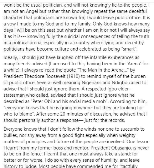 Ideally, I should just have laughed off the infantile exuberances as many friends advised (I am used to this, having been in the ‘Arena’ for a while). I always re-read the quote “The Man in the Arena…” by President Theodore Roosevelt (1910) to remind myself of the burden of public office. Several well meaning Nigerians and Ndigbo called to advise that I should just ignore them. A respected Igbo elder-statesman who called, advised that I should just ignore what he described as “Peter Obi and his social media mob”. According to him, “everyone knows that he is going nowhere, but they are looking for who to blame”. After some 20 minutes of discussion, he advised that I should personally author a response— just for the records.