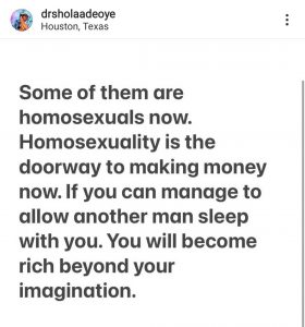Speaking of the things African pastors allegedly now do for money, he wrote: “Homosexuality is the doorway to making money now.