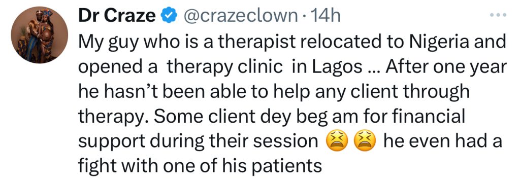 “My guy who is a therapist relocated to Nigeria and opened a therapy clinic in Lagos … After one year he hasn’t been able to help any client through therapy. Some clients dey beg am for financial support during their session he even had a fight with one of his patients,” he wrote.