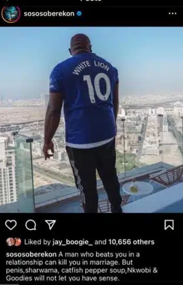 He mentioned some stuff like sharwama, catfish pepper soup, Nkwobi and above all sex. He wrote on his page, “A man who beats you in a relationship can kill you in marriage. But p3nis, sharwama, catfish pepper soup, Nkwobi & Goodies will not let you have sense.”