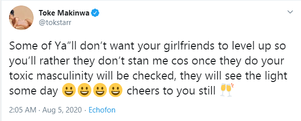 Some of Ya”ll don’t want your girlfriends to level up so you’ll rather they don’t stan me cos once they do your toxic masculinity will be checked, they will see the light some day. cheers to you still