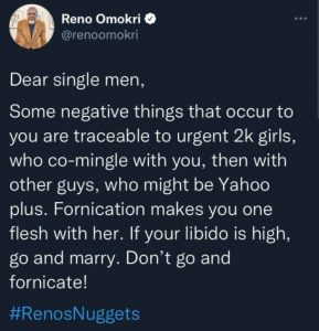 “Nigerian activist and author, Reno Omokri has advised single men to desist from fornication, while explaining the cause of their problems.