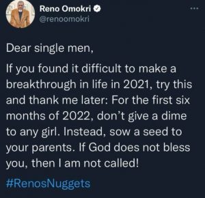 Omokri also told men who found it difficult to get a breakthrough in 2021, not to give money to women in 2022. He added that they should sow a seed in the life of their parents for the first 6 months of the new year and watch God bless them.
