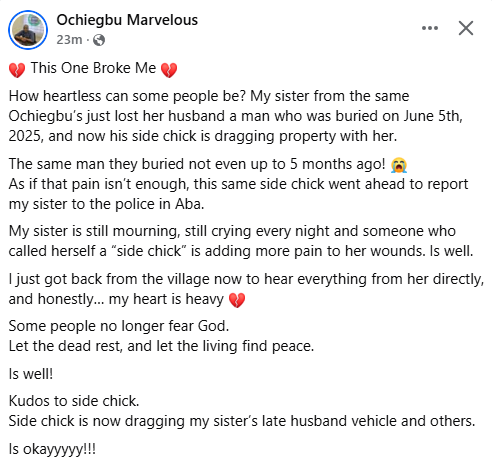“This One Broke Me. How heartless can some people be? My sister from the same Ochiegbu’s just lost her husband, a man who was buried on June 5th, 2025, and now his side chick is dragging property with her,” he wrote.